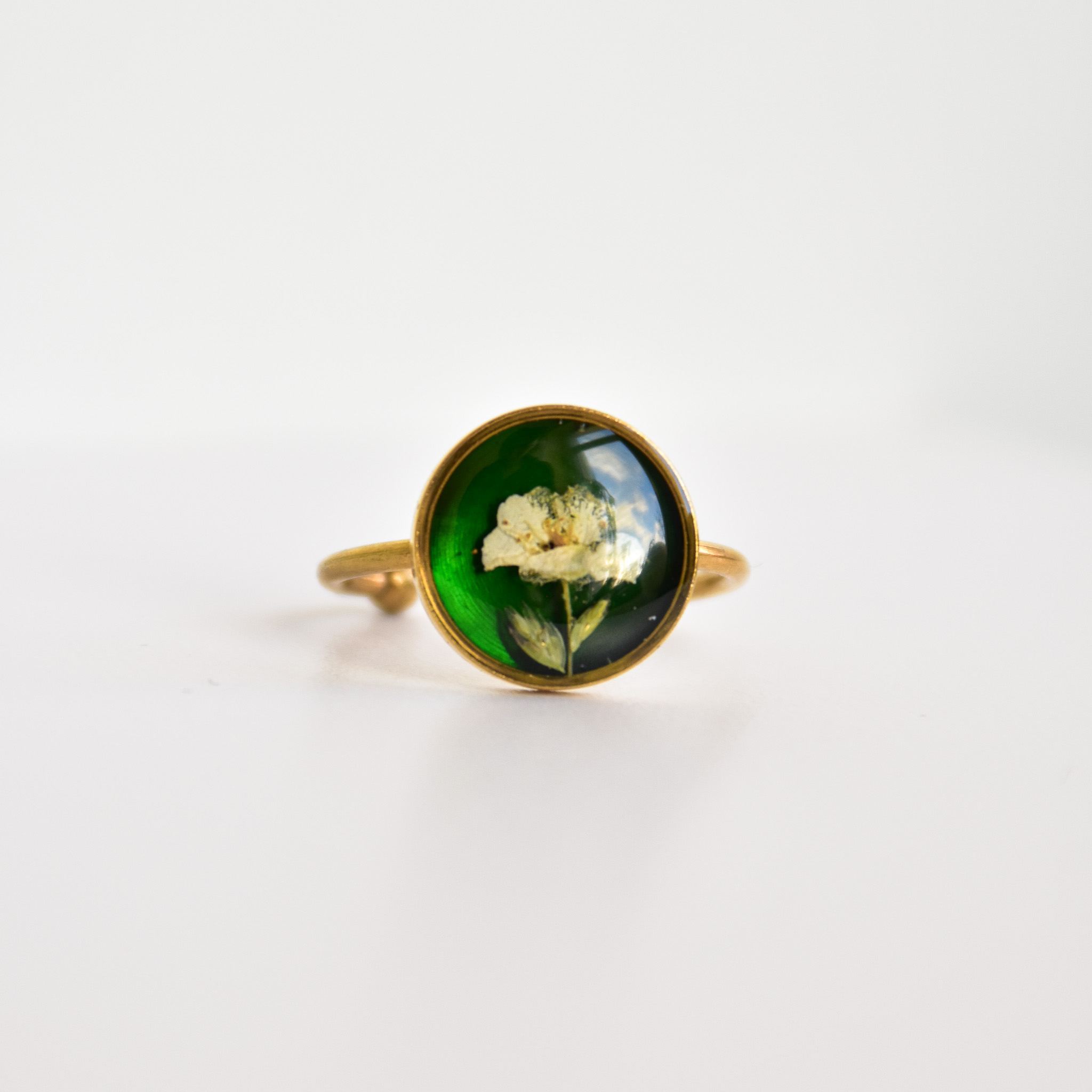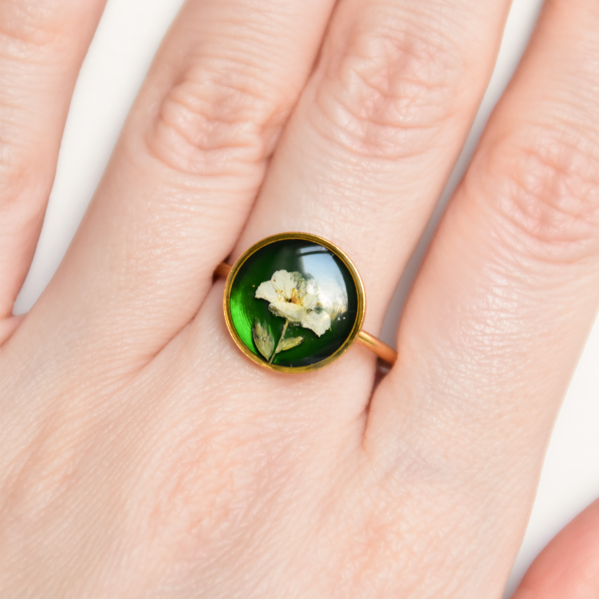 pierścionek – biały kwiat i listki na zielonym tle