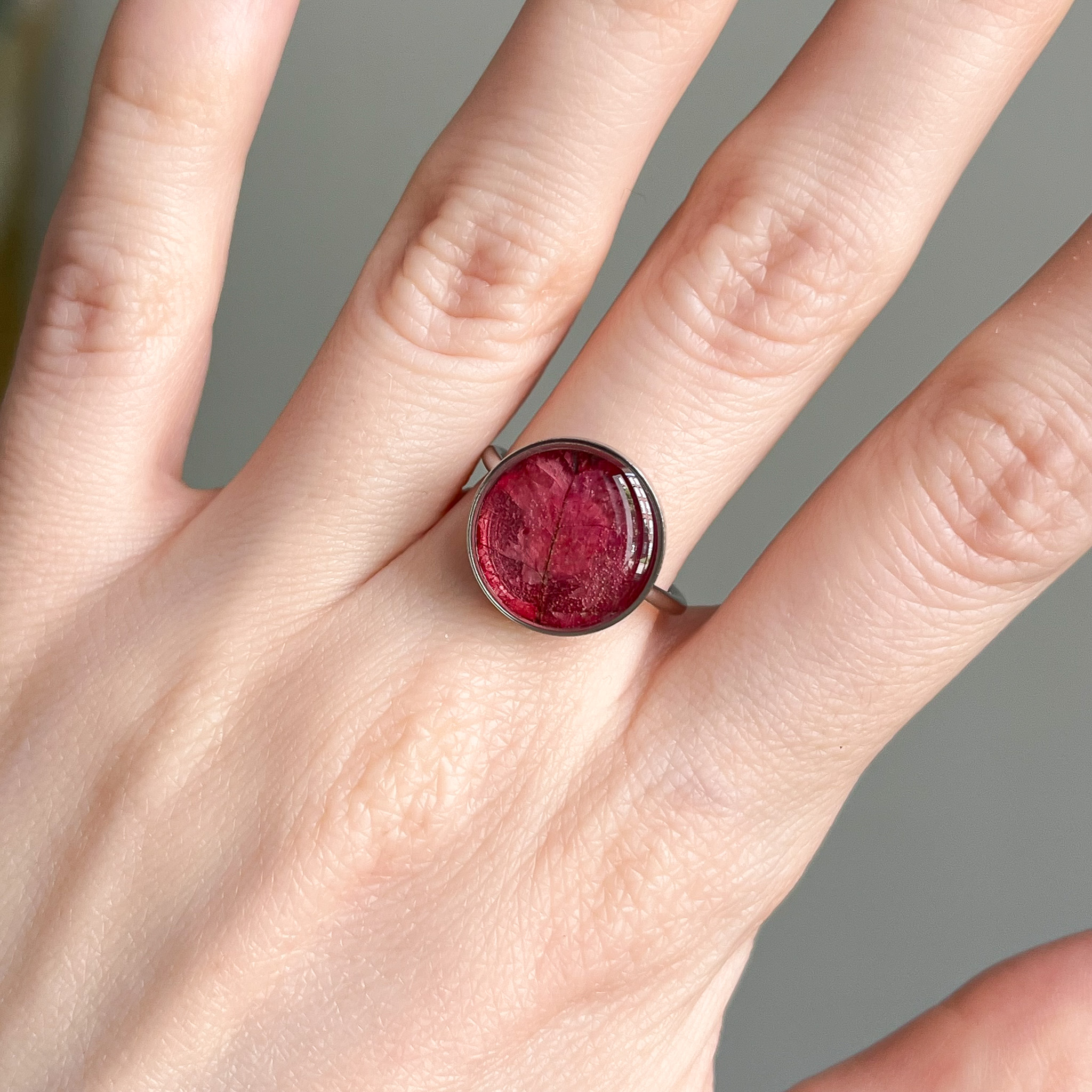 pierścionek – różowy płatek bugenwilli z widoczną strukturą (duży)