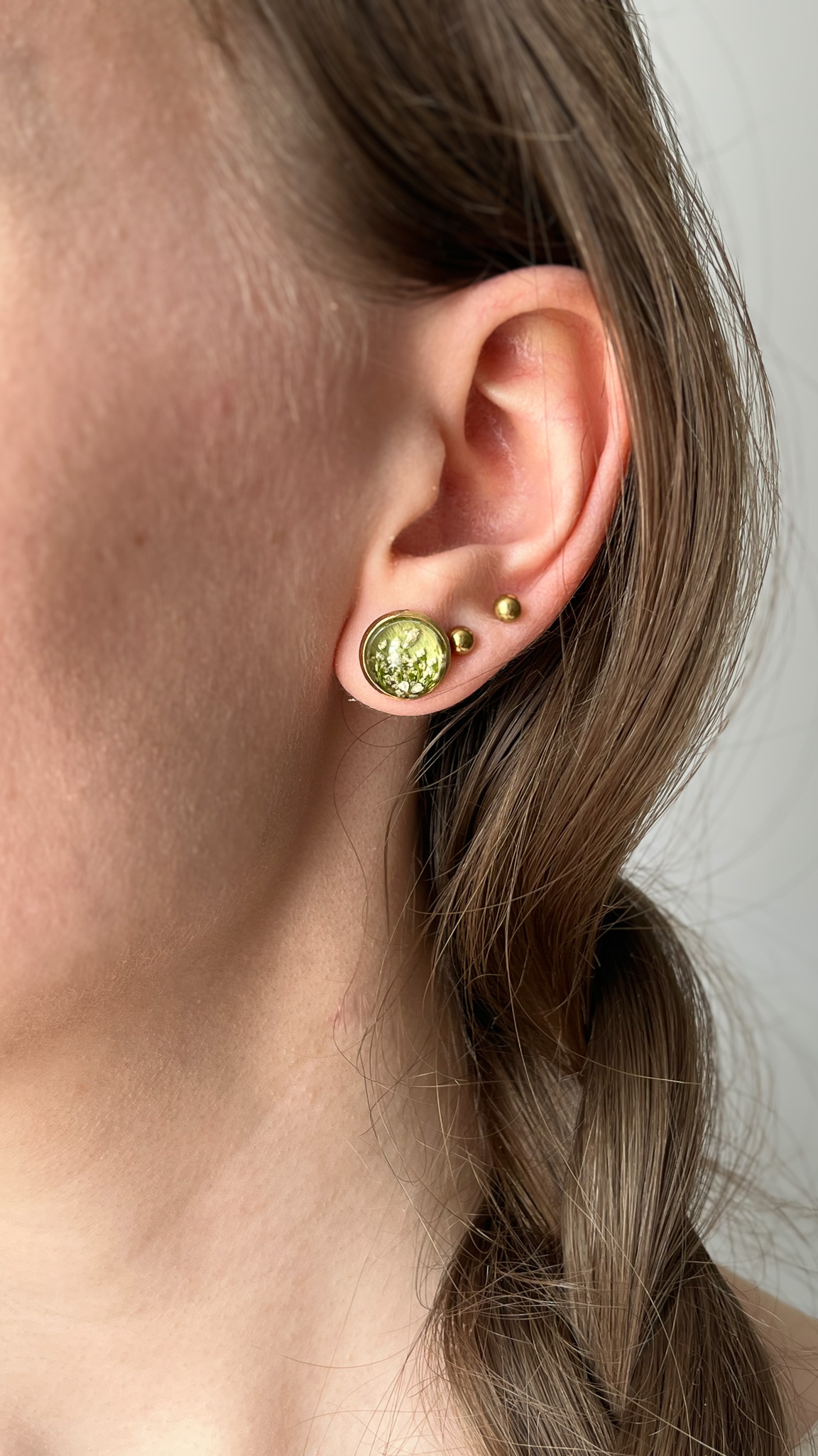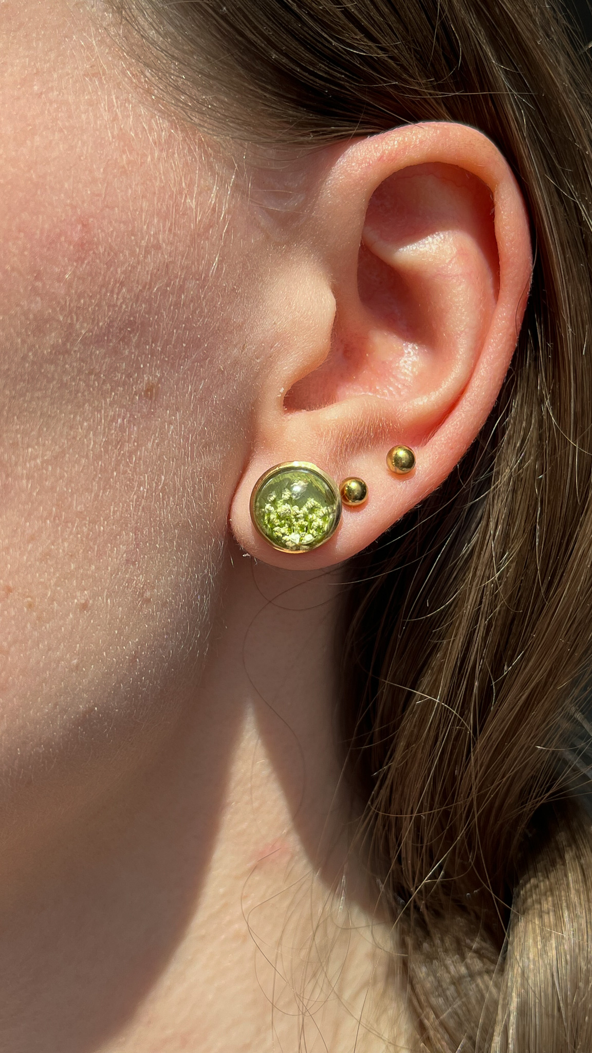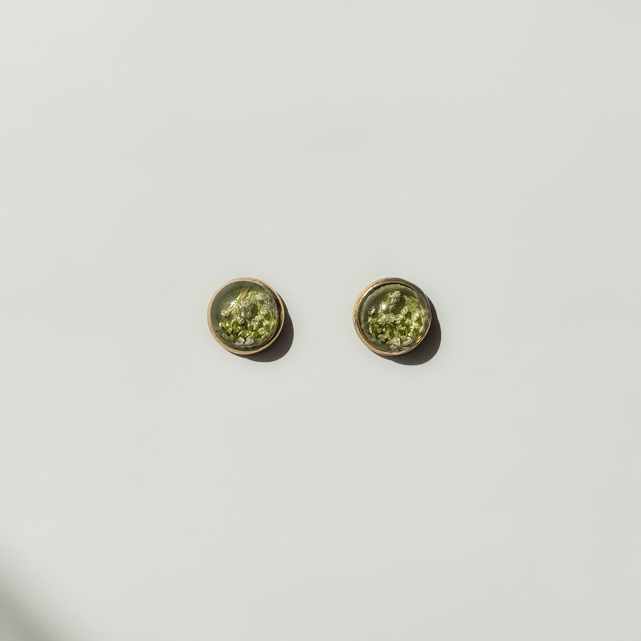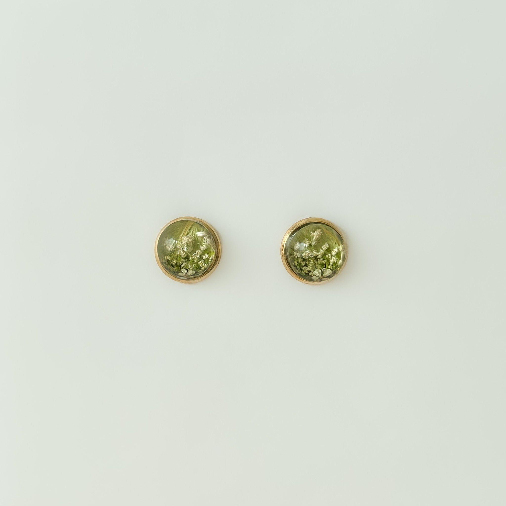 Intensywnie zielone oczka z dodatkiem białych kwiatów, przywodzące na myśl świeżą trawę.