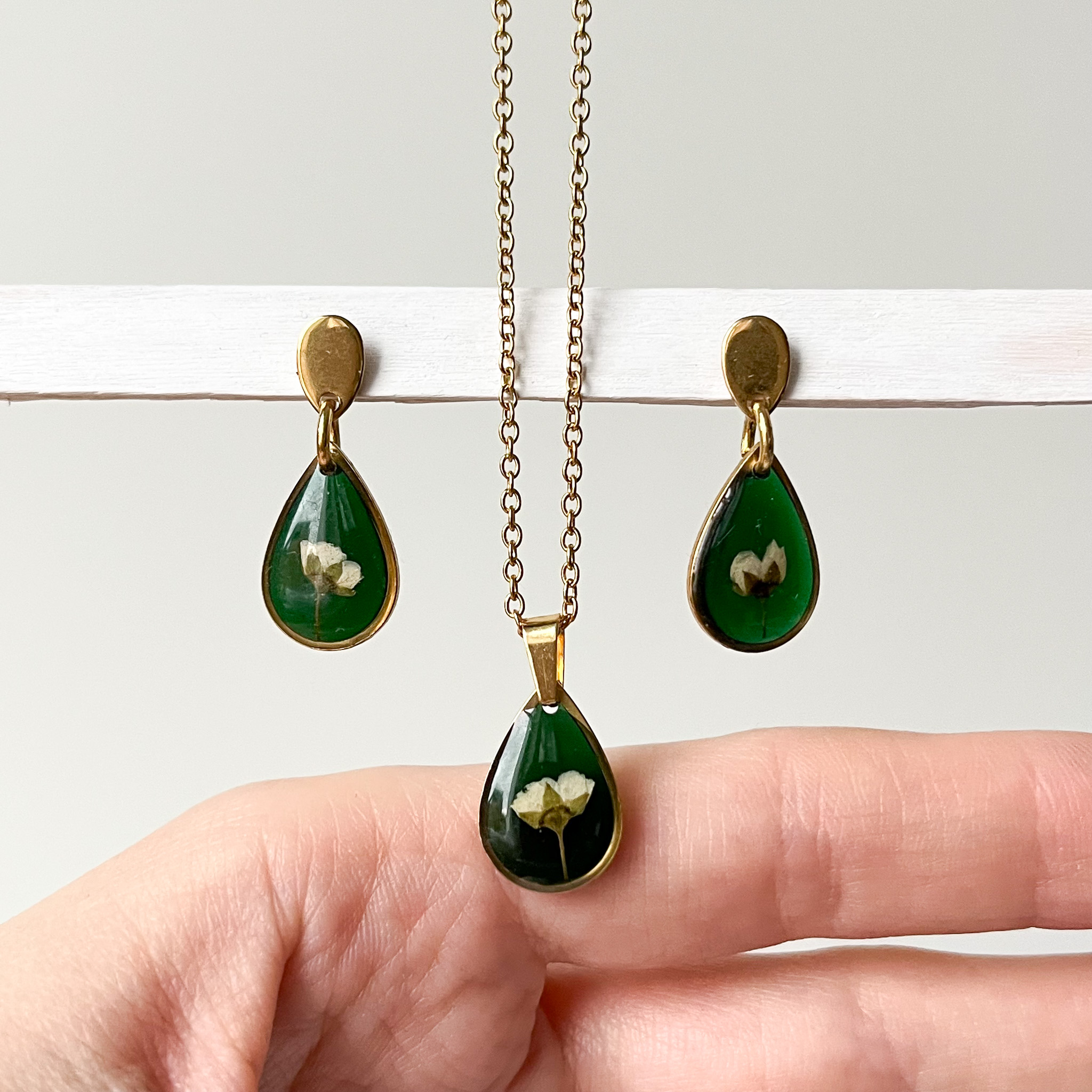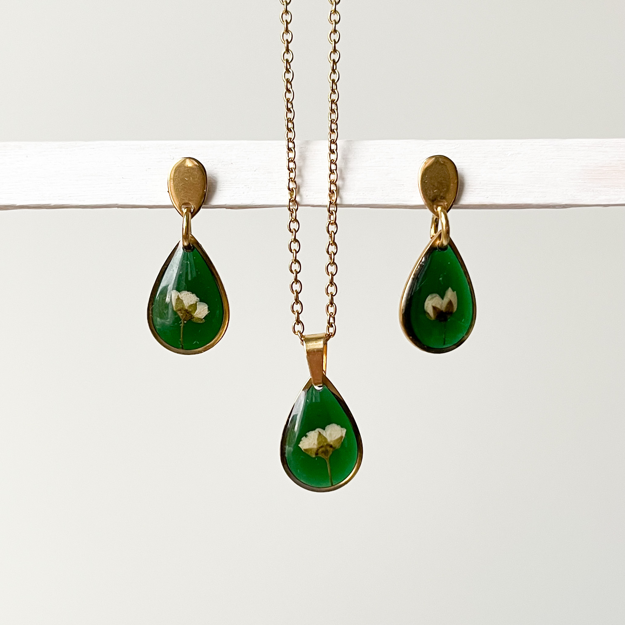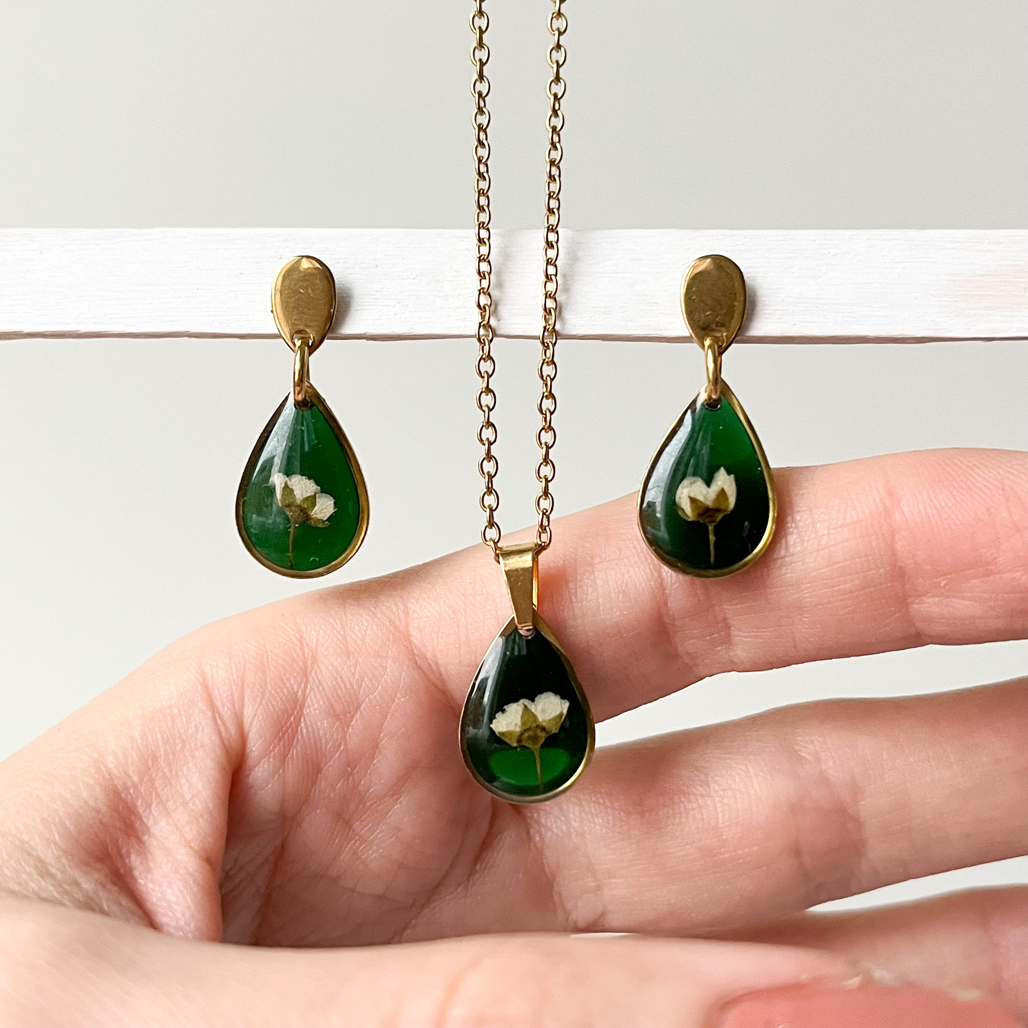 Są w kolorze głębokiej zieleni ze złotym, tłoczonym logo, a w środku znajduje się miękki wkład, dzięki któremu biżuteria się nie porysuje. Zachęcam do tego, żeby to w nim przechowywać biżuterię. Oprócz tego, w środku znajdziesz małą kartkę z podziękowaniem, kontaktem i przede wszystkim - instrukcją pielęgnacji, czyli co zrobić, żeby biżuteria służyła jak najdłużej. O ile w uwagach nie zaznaczysz inaczej - będzie tam również paragon.